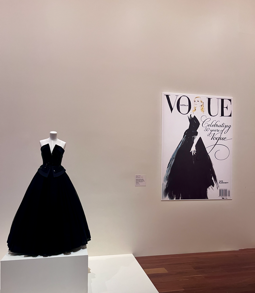 The exhibition showcases several of Grant’s evening gowns all of which are stunning. Two standouts are the red taffeta gown with a sweeping train. The other, a black bustier trimmed with Swarovski crystals and tulle skirt. Cate Blanchett, a long time follower of Grant, was illustrated wearing this gown for the 50th anniversary of Vogue Australia